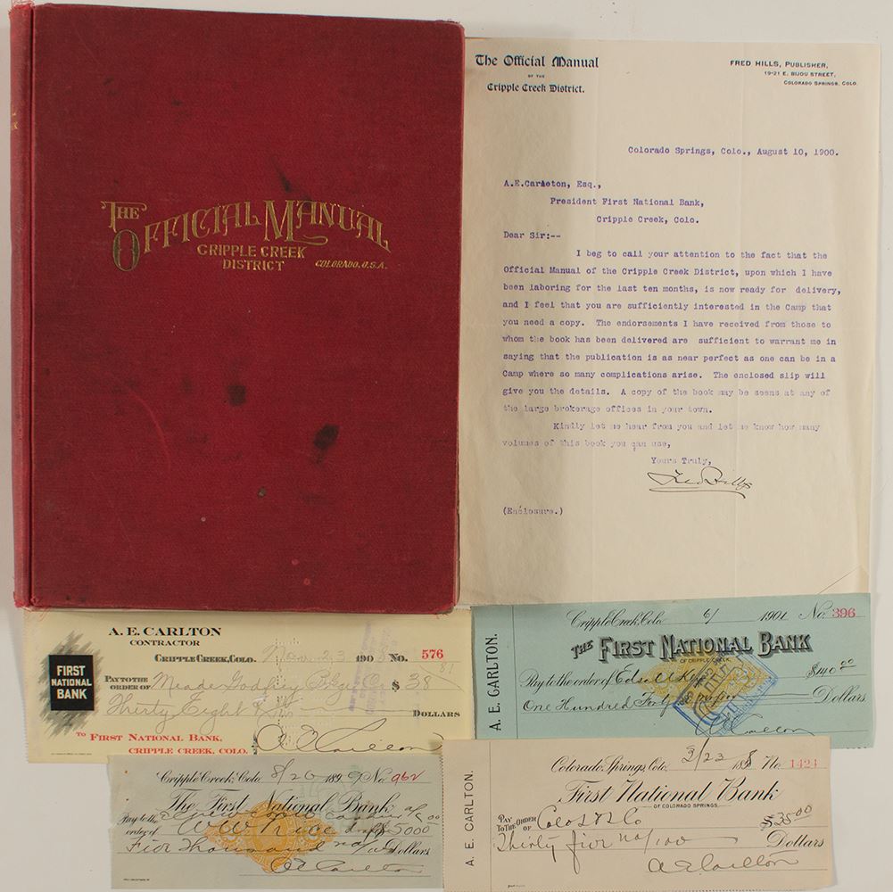An unbelievable set of items from Cripple Creek. First, The Official Manual of the Cripple Creek District Colorado, U.S.A. Vol. I. A.D. 1900. Published by Fred Hills, E.M., Colorado Springs, Colo. 495 pages with color. Includes large map Showing the Surface Holdings of the Mining Companies in the Cripple Creek Mining District. Map has tape repairs. Book includes index to mining companies and a general history of the area. Each company has a detailed entry including diagrams of the claims. What makes this copy of this scarce book even more amazing is that it was the personal copy of H.J. Gehm, a man involved with many mining companies in Cripple Creek, including Vindicator Cons. G. M. Co., Republic G. M. Co., the Delmonico Mine, Mary Nevin G. M. Co., and the Colorado Trading and Transfer Co., among others. This copy has pen and pencil markings indicating that Gehm was actively using it as a resource. Condition: front and back boards have become detached from pages and have dirt and other wear. Pages are mostly bright; some have bends in bottom corners. In addition to the book, a letter from the publisher, Fred Hills, to A.E. Carlton, another central mining and financial figure in Cripple Creek. The letter is Hills' pitch for the book to Carlton and comes on the official letterhead for the book. Lastly, four A.E. Carlton checks are included (spanning 1898-1901). Wonderful collection of Colorado mining history!