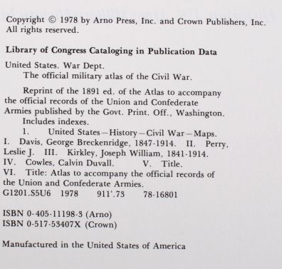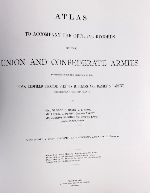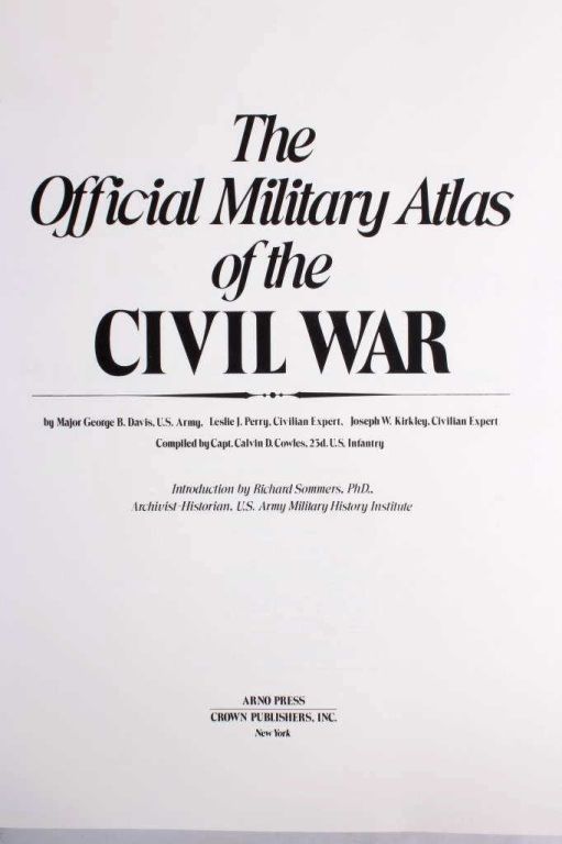Here, in brief, is a completely indispensable tool for both historian and Civil war buff, reproduced with absolute precision and fidelity. The Official Military atlas does not only add to an understanding of the CivilWar, it is vital to one. The author of this atlas is George B. Davis, Copyright in 1978 and published by Arno Press, inc. and Crown Publisher, inc. Measures 16.75"x13.5"