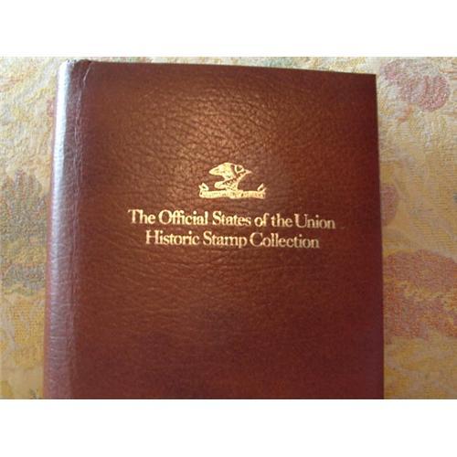 The Official States of the Union Historic Stamp Collection was issued by Postmasters of America in a single edition limited to no more than 15,000 sets. It is further certified that this collection consists of 50 out-of-issue mint condition stamps honoring each of the states and that each stamp is combined on a Philatelic Presentation with an original engraved illustration depicting the most famous landmark or historic monument of the honored state. This collection is handsomely bounded in leather and very rare. A Certificate of Authenticity included in the edition. Any questions....please ask.