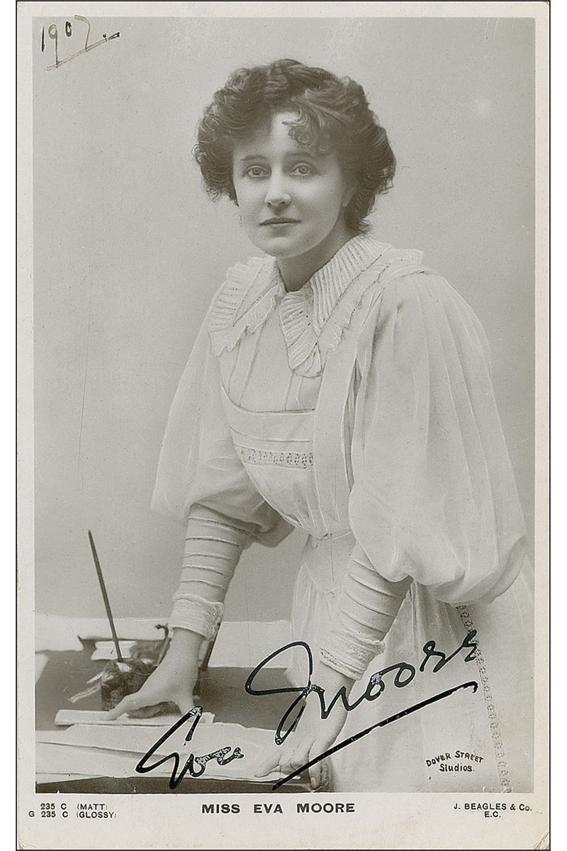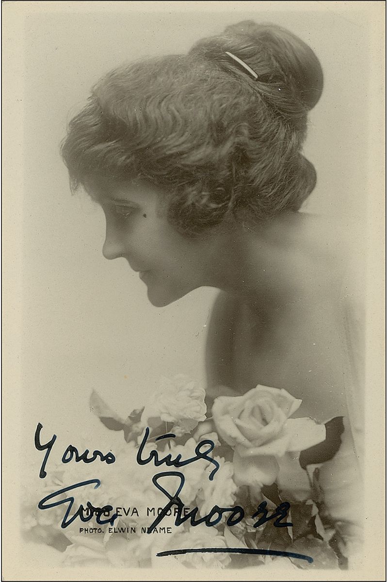 English actress (1870–1955) and suffragist whose career on stage and in film spanned six decades. She starred in James Whale’s 1932 film The Old Dark House. Two scarce vintage glossy 3.5 x 5.25 postcard photos, each signed in fountain pen by Moore, adding a brief sentiment to one photo. Moore also adds, “Many thanks, E. M.,” to the reverse of one photo. In very good condition, with scattered creases and surface impressions to both images, with a bit of irregular adhesion to one signature. Accompanied by two cardstock photos from the film.