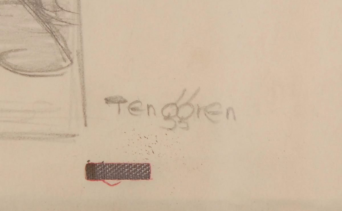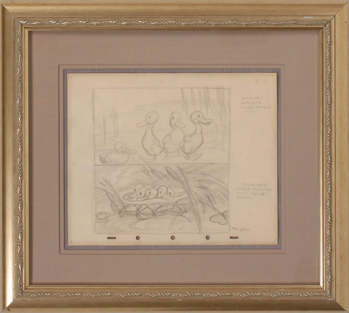 (Disney, 1937) Original storyboard production drawing by Gustaf Tenggren featuring the ducklings from the Silly Symphony cartoon The Old Mill, showing them quacking during sunset and huddled together during the raging storm. Signed in the lower right, “Tenggren.” Accomplished in graphite on 11.75 x 9.75 animation paper. Mounted, cloth-matted, and framed to an overall size of 20 x 18. In very good to fine condition, with wear to borders. A noted Swedish-American artist, Tenggren was a chief illustrator for The Walt Disney Company in the late 1930s before moving on to work on children’s Little Golden Books. Some of the films he worked on were Snow White and the Seven Dwarfs, Pinocchio, Fantasia, and Bambi. This storyboard represents the storm section of The Old Mill—the high point of the short—when the animals encounter a thunderstorm that nearly destroys their habitat. It was innovative in that it was the first film to use Disney’s multiplane camera as a test for use in Snow White. Considered one of the great short cartoons ever made, The Old Mill won the 1937 Academy Award for Best Short Subjects: Cartoons. In addition to the cinematic importance of this storyboard, Tenggren’s artwork is highly sought after in its own right.