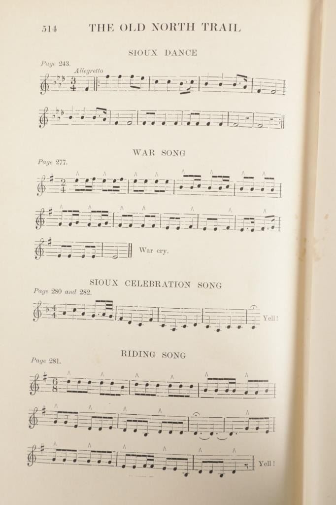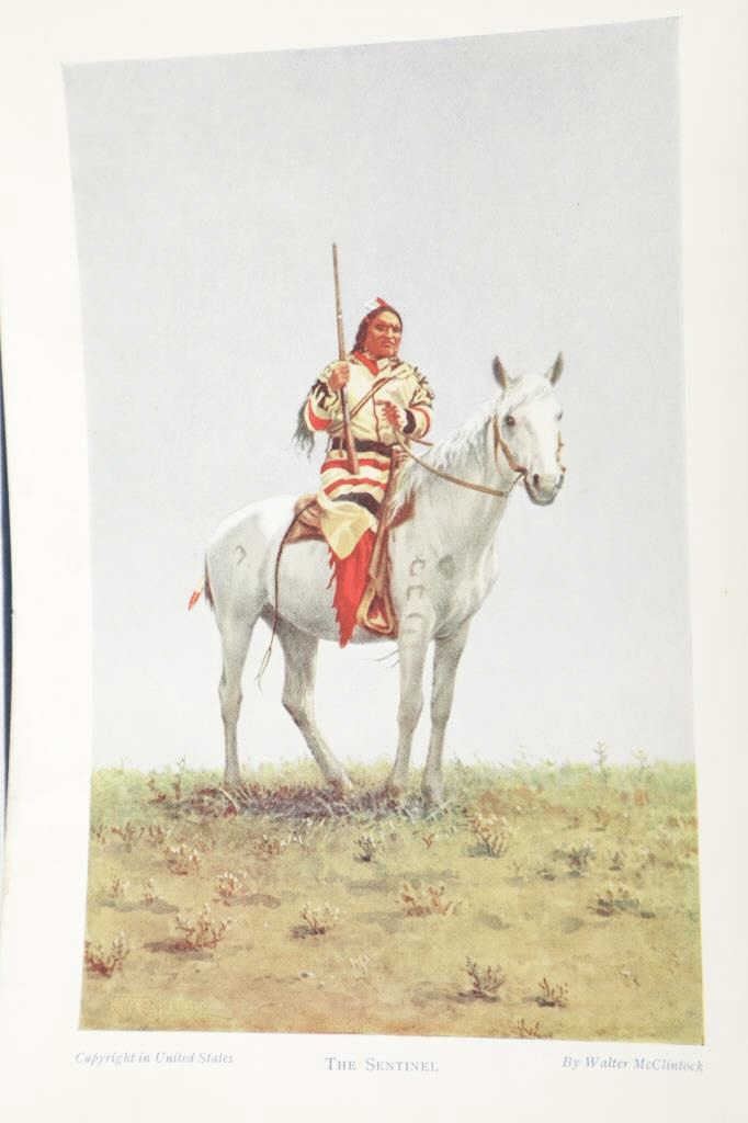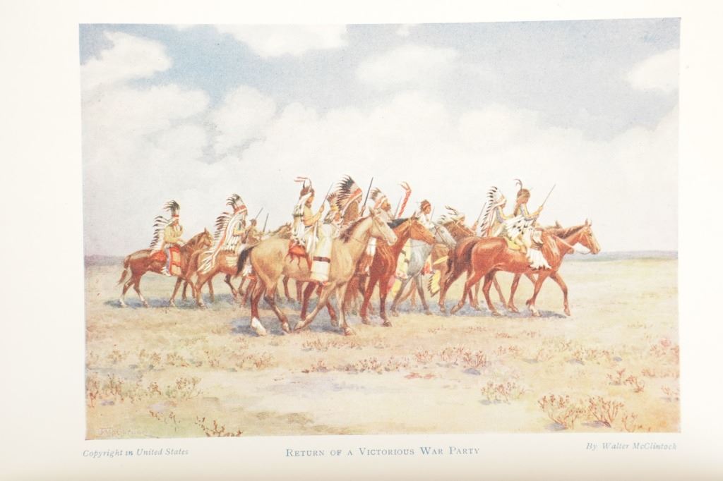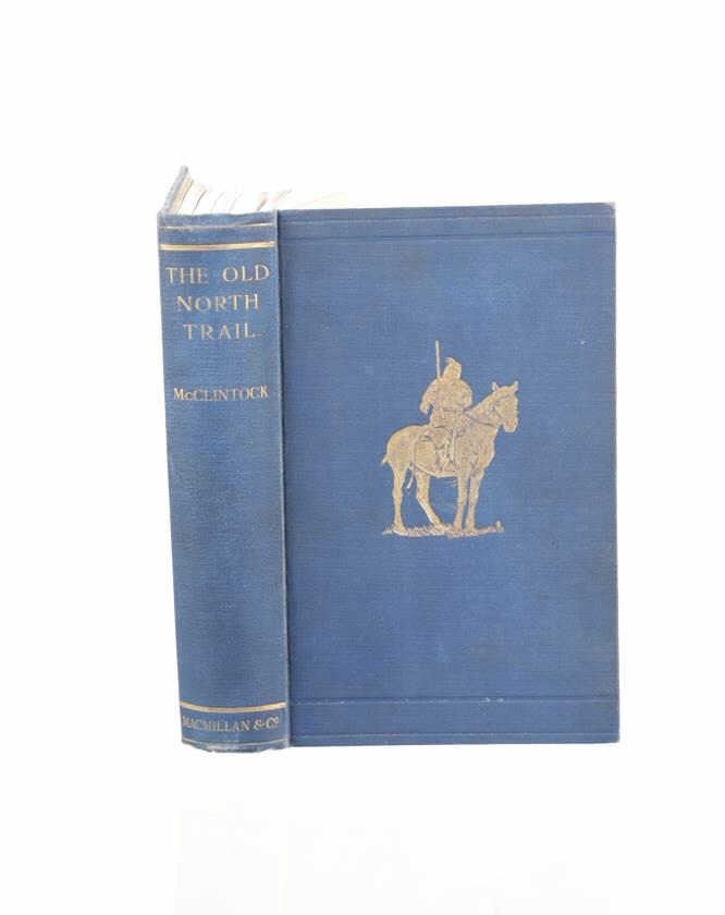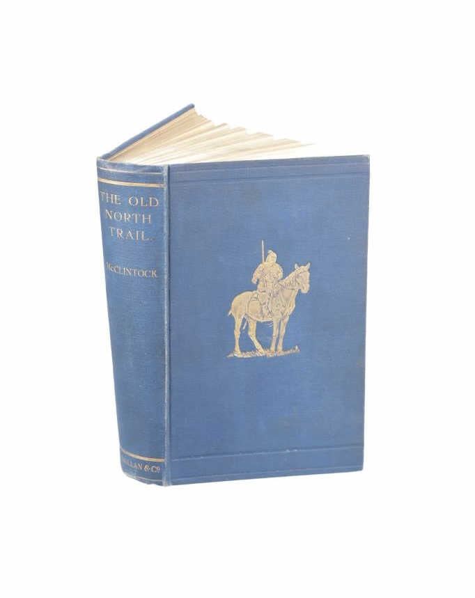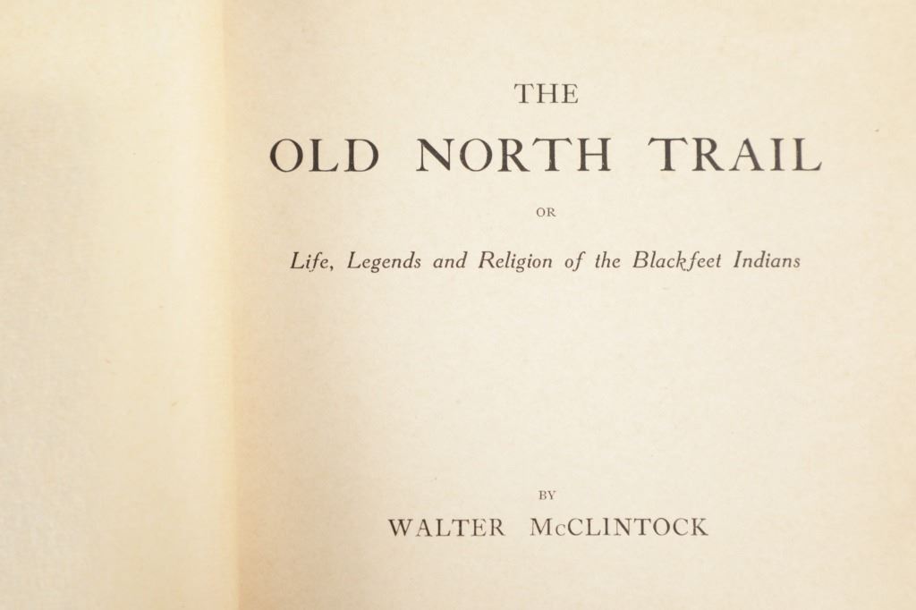Featured in this lot we have a First Edition of "The Old North Trail" by Walter McClintock, 1910, Macmillan and Co., Limited, London publisher. "The Old North Trail or Life, Legends and Religion of the Blackfeet Indians" details the first person experiences and adventures of the author among the Blackfeet tribe. The book contains numerous colored illustrations and black and white photos. McClintock went to northwestern Montana as a member of a U.S. Forest Service expedition. He spent the next four years living on the Blackfoot Reservation as the adopted son of Chief Mad Dog, the high priest of the Sun Dance. Fold-out map, "The Country of the Blackfeet Indians" attached on page 533. Original blue cloth bound gold gilt stamped illustrated hardcover is in nice condition, gold gilt is still bright. Front cover stamped illustration is the same as frontispiece. Very slight scuffing noted. Intact pages feature gold gilt top edge, age tanning and foxing observed. Measures 5.5"W x 8.75"L x 1.5"D, weight 2lb, 10oz.