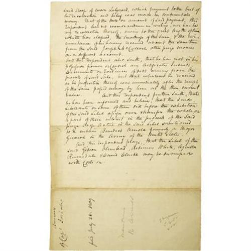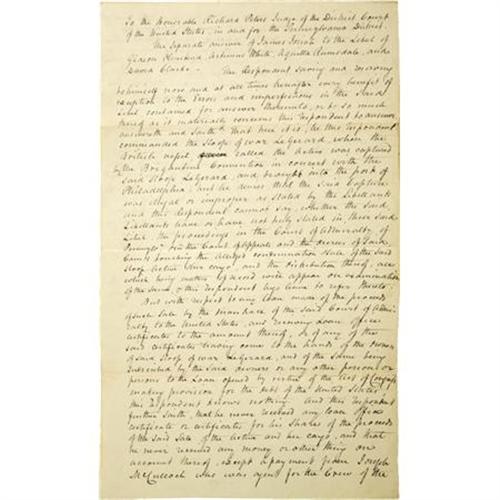 <B>The Olmstead Case - Manuscript Document.</B></I> 2 pages, 8" x 13" Philadelphia July 28, 1809, a deposition concerning the final stages of the long and drawn-out Olmstead case, an important early American legal precedent involving individual property rights. Gideon Olmstead was one of four captured American mariners who were pressed aboard a British supply ship (the Active) bound from Jamaica to British occupied New York in 1778. During the voyage, the four mutinied and took control of the ship. While off the coast of New Jersey, a Pennsylvania armed brig, Convention, with a privateer Le Gerard, commanded by James Josiah. The pair took control of the British vessel, claiming it as a prize in the name of the State of Pennsylvania, much to the consternation of Gideon Olmstead and his compatriots, who believed the prize rightfully theirs. The legal dispute dragged on from 1778 until 1809 when Olmstead finally won a decisive legal victory securing his right to the prize. The case helped establish the role of the federal courts in protecting individual rights against the state. This document is addressed "<I>To the honorable Richard Peters Judge of the District Court of the United States, in and for the Pennsylvania District.</B></I>" Peters (1744-1828) was the federal judge who oversaw the Whiskey Rebellion trials, and had already heard motions concerning this case for a number of years. This document concerns the position of James Josiah in his response to accusations that his seizure of the Active was illegal or improper. Headed : "<I>The separate answer of James Josiah to the Libel of Gideon Olmstead, Artimus White, Aquilla Rumsdale, and David Clarke,</B></I>" it reads in part: <I>"...The Respondent saving and...himself now and at all times hereafter ever benefit of exception to the errors and imperfections in the land said libel contained for answer thereunto, of to so much thereof as it materially concerns this respondent to answer, answereth and saith: That true it is, he his respondent commanded the sloop of war Le Gerard, when the British vessel called the active was captured by the Brigantine Convention in concert with the said sloop Le Gerard, and brought into the port of Philadelphia, but he denies that the said capture as illegal or improper as stated by the Libellants and this respondent cannot say, whether the said Libellants have or have not truly stated in their said Libel, the proceedings in the court of admiralty of Pennsylva. in the court of appeals and the decrees of said courts vouching the alleged condemnation & sale of the said sloop Active & her cargo, and the distribution thereof, all which being matters of record will appear on examination of the same, & this respondent begs leave to refer thereto. But with respect to any loan made of the proceeds of such sale by the marshal of the said court of admiralty to the United States, and receiving loan office certificates to the amount thereof, or of any of the said certificates having come to the hands of the owner of said sloop of war Le Grand, and of the same being subscribed to the loan opened by virtue of the Act of Congress making provision for the debt of the United States, this respondent knows nothing. And this respondent further saith, that he never received any loan office certificate or certificates for his share of the proceeds of the said sale of the Active and her cargo, and that he never received any money or other thing on account thereof, except a payment from Joseph McCulloch who was agent for the Crew said sloop of war Le Gerard, which payment to the best of his recollection and belief was made in continental money. That of the date or amount of said payment, this respondent had in memorandum in writing nor had he any recollection thereof, owing to the great length of time which has elapsed, the Smallness of the sum & the circumstance of his having received about the same time from the said Joseph McCulloch other prize monies on a different account. And this respondent also saith, that he has not in his possession any certificates...documents or evidences of debt from the proceed of said sale, but that whatever he received as his proportion thereof was immediately after the receipt of the same passed away by him at the new current value. And this respondent further saith, that he has been informed and believed, that the said Libellants or some of them and before the exhibition of the said libel assign over & transfer the whole or a part of their interest in the proceeds of the said prize sloop active in the said Libel mentioned to a certain Benedict Arnold formerly a major general in the Army of the United States. And this respondent prays, that the Libel of the said Gideon Olmstead...may be dismissed with Costs &c...</B></I>" For some insightful commentary into this case, see Kenneth W. Treacy, "The Olmstead Case, 1788-1809" The Western Political Quarterly, (Vol. X, No. 3) Sept., 1957, pp. 675-691. Light creases, extremely light toning at margins, else fine.' This is significant early legal history that helped define the new Republic. <I>Ex. Henry E. Luhrs Collection.</B></I><BR><BR><BR><b>Shipping:</b> Flat Material, Small (<a target="_blank" href="http://www.heritageauctions.com/common/shipping.php">view shipping information</a>)