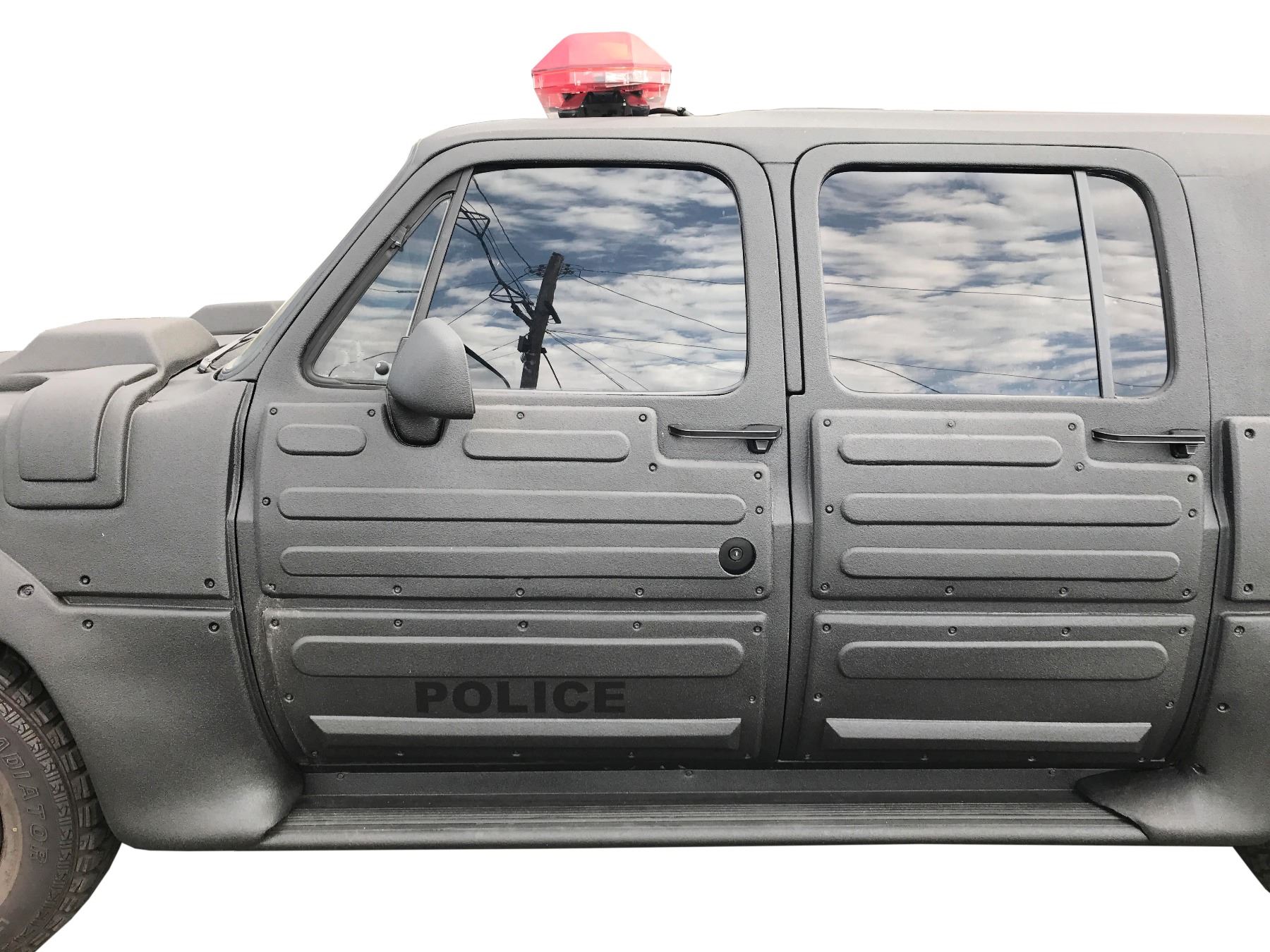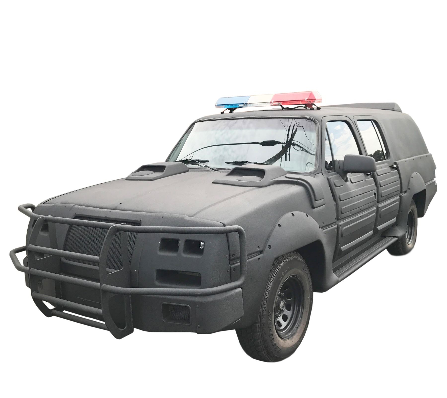 The One (2001) Jet Li's (Gabriel Yulaw) Hero Futuristic Police Swat Van - This swat vehicle was custom-made by Columbia Pictures for use by Jet Li as he portrayed "Gabriel Yulaw" in the 2001 American science fiction-martial arts film The One. Yulaw is a "Multiverse Authority (MVA) agent", a police force that governs interdimensional travel. The vehicle is a Chevrolet R2500 Suburban, a 4-door SUV with 7.4L V8 engine. The vehicle has been customized for the film, as it is fully body armored in LINE-X and has a matte and gloss black paint job. The vehicle also has fully functioning police lights. This instantly recognizable black futuristic police van plays a very prominent role in the movie, and is seen throughout the film. The vehicle shows wear from production use, and is in excellent screen used condition.