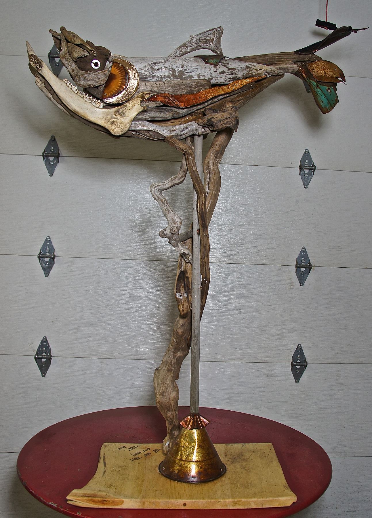 Description: While traveling thru Browning Montana I found an old horse jawbone on the side of the road, this ignited my imagination and I automatically knew this would make a great large fish sculpture. What a fight this fish would give as you struggled to reel him in! And then....... This sculpture has vintage Ford and Chevy automobile metal from old hoods, and fenders, copper, Austrian crystal for eyes. On a vintage washing utensil and pine slab. Estimated weight 30 lbs.