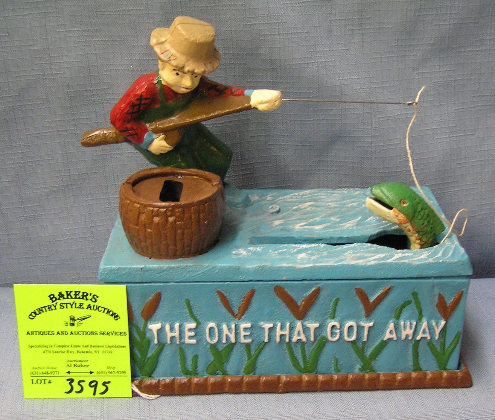 Hand painted cast iron The One That Got Away fisherman mechanical bank mint with original box circa 1962 est. value $250.00-$300.00