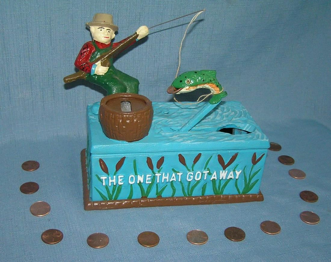 "The One That Got Away" fishing bank all hand painted cast iron circa 1962 absolutely mint unplayed with condition est. value $250.00-$275.00