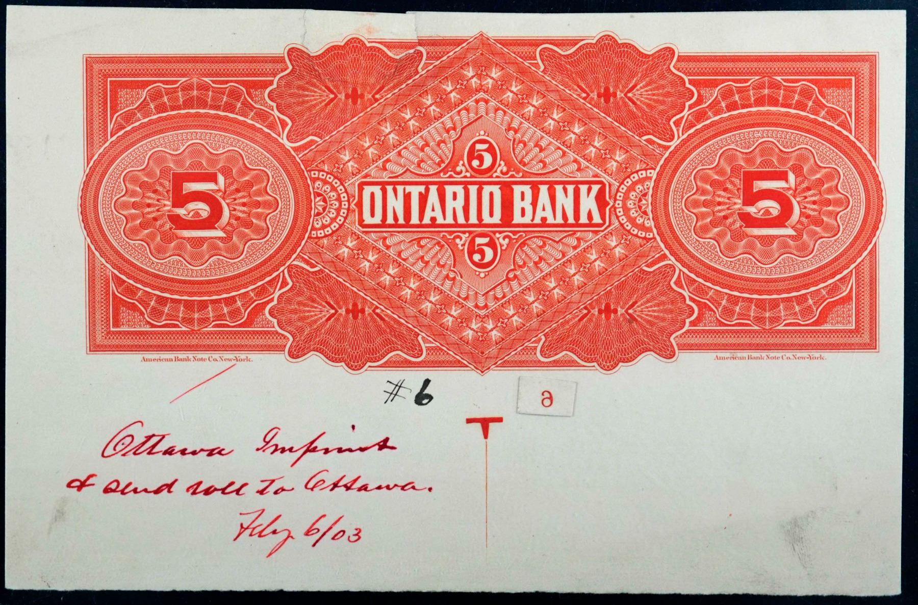 The Ontario Bank; 1888 $5 CH-555-18-02Pa, Legacy Currency Grading Choice About Uncirculated-58. Edge tears at top left of center.