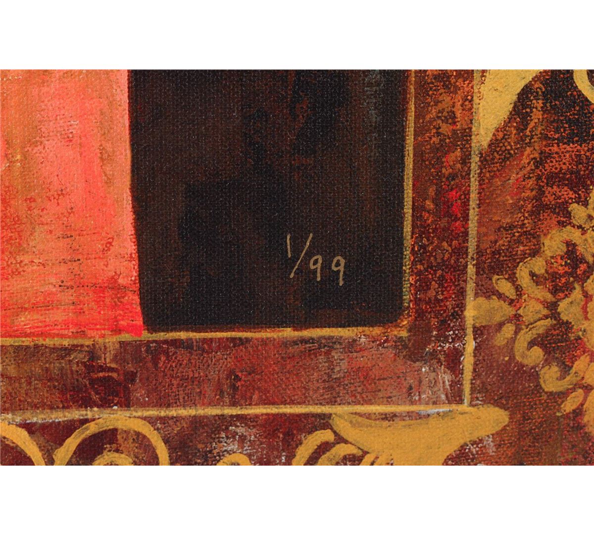 Add a splash of color and sophistication to your home or office with the gorgeous work of Arbe. The sensual color and deep emotion of this piece will provide the perfect atmosphere! The Oracle by Arbe is a Giclee on canvas. Year of production: 2010. Each print in edition is hand signed by the artist. Measures 25 x 31 inches (frame).