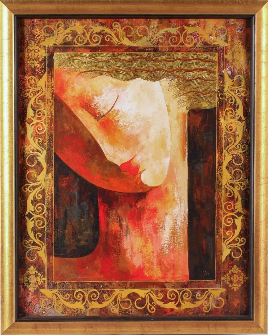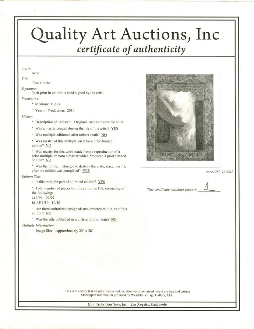 Add a splash of color and sophistication to your home or office with the gorgeous work of Arbe. The sensual color and deep emotion of this piece will provide the perfect atmosphere! The Oracle by Arbe is a Giclee on canvas. Year of production: 2010. Each print in edition is hand signed by the artist. Measures 25 x 31 inches (frame).