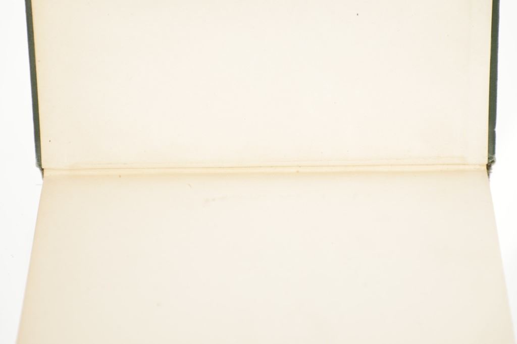 The green cloth bound gold gilt embossed book is in good condition with floral motif on front and spine, the cover has slight scuffing, pages are intact, foxing and age tanning noted. Measures 5"W x 7.75"L x 1.25"D