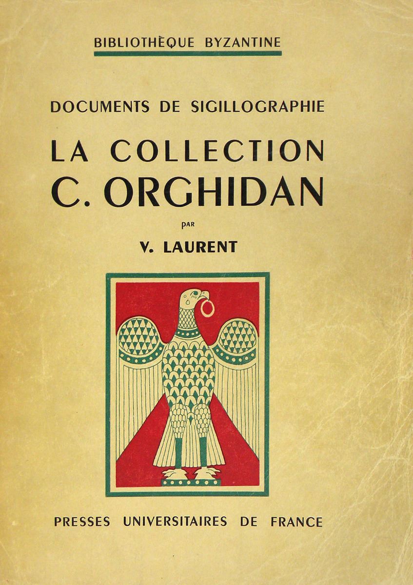 Laurent, V(italien). DOCUMENTS DE SIGILLOGRAPHIE BYZANTINE: LA COLLECTION C. ORGHIDAN. Paris: Bibliothèque Byzantine, 1952. 4to, later black half calf, gilt; spine with four raised bands, two maroon lettering pieces, gilt; original printed card covers bound in; silk marker. Blank leaf, (4), 342, (2) pages; 691 detailed descriptions; 70 fine plates. Original card covers a touch worn. Near fine. Scarce and important.