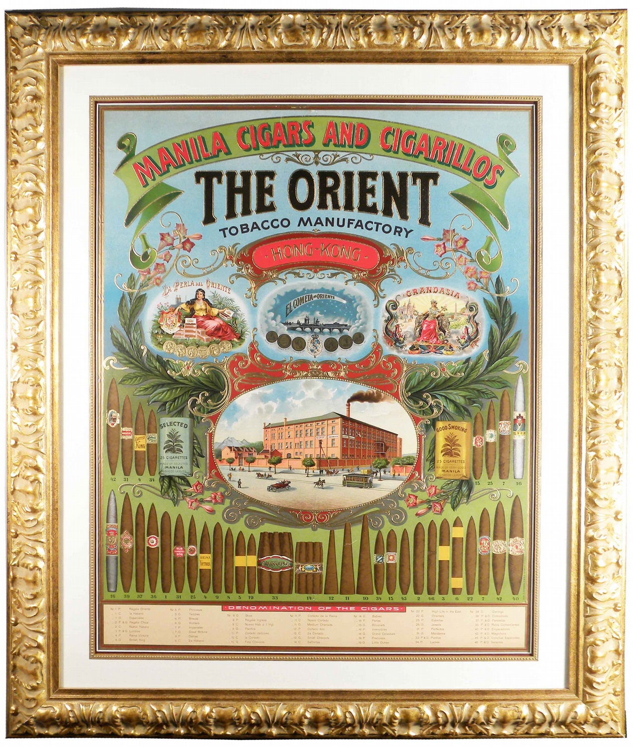 The Orient Tobacco Manufactory Cigar Embossed Gold Leaf Paper Sign. Professionally matted and framed. Mint condition. 25 X 32 inches image only.