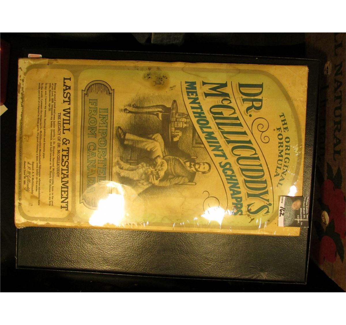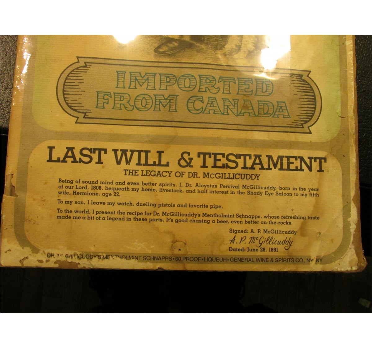 "The Original Formula Dr. McGillicuddy's Menthomint Schnapps Imported from Canada Last Will & Testament The Legacy of Dr. McGillicuddy. Being of sound mind and even better spirits, ,I Dr. Aloysius Percival McGillicuddy, born in the year of our Lord, 1808, bequeath my home, livestock, and half interest in the Shady Eye Saloon to my fifth wife, Hermione, age 22. To my son, I leave my watch, dueling pistols and favorite pipe. To the world, I present the recipe for Dr. McGillicuddy's Menthomint Schnapps, whose refreshing taste made me a bit of a legend in these parts. It's good chasing a beer, even better on-the-rocks. Signed: A.P. McGillicuddy A.P. McGillicuddy Dated: June 28, 1891. An interesting poster measuring 9" x 15.5".