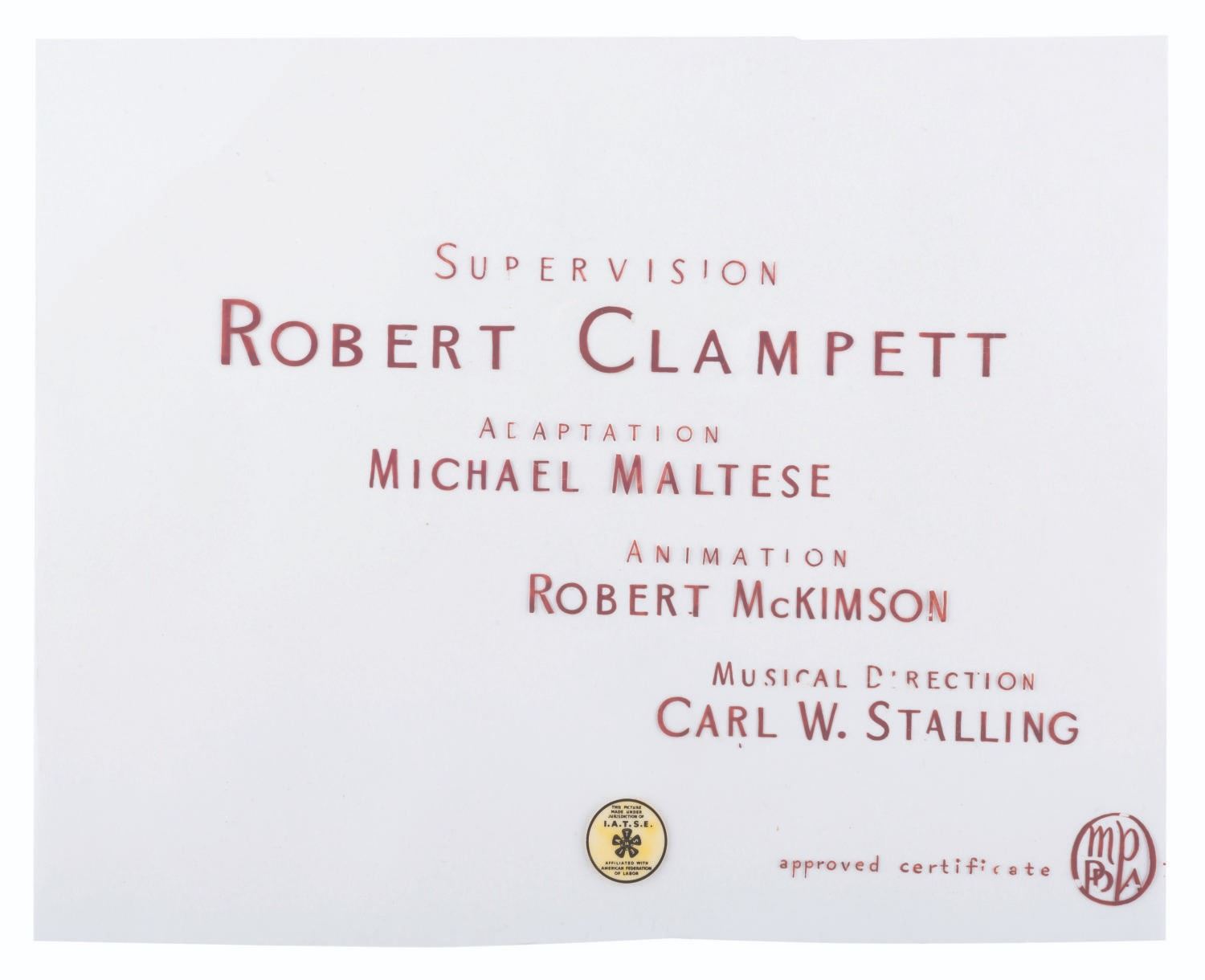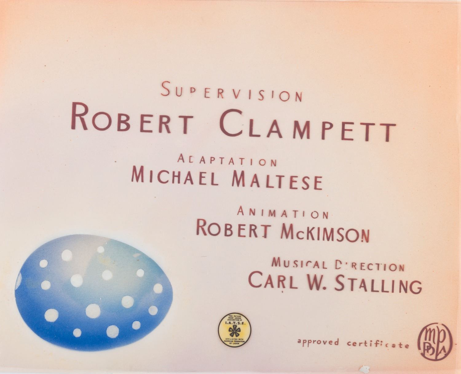 (Schlesinger, 1942) The original opening credits cel and background from “Horton Hatches the Egg,” directed by Bob Clampett and adapted from Dr. Seuss. Since the titles were changed to the Blue Ribbon series card, the original cel and background have rarely been seen. Both pieces are trimmed to 8” x 10” and are in very good condition with light paint loss to small areas of the letters.