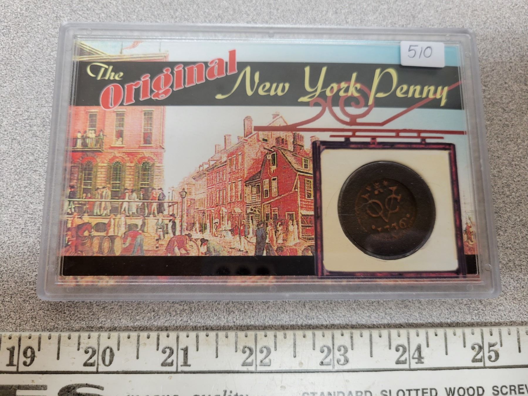 The Original New York Penny. Minted by the Dutch in 1736 and similar to ones used by the Dutch in the era when they bought the island of Manhattan (present-day New York City), for the equivalent of $24 in Dutch coins. Housed in a Morgan Mint hard plastic holder.
