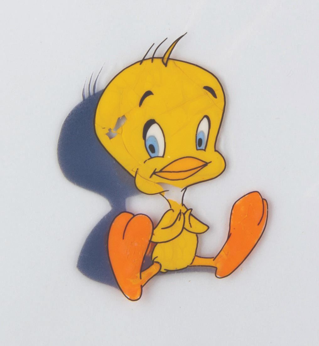(Warner Bros., 1947) The original cel overlay for the title card of the Merrie Melodies short “Tweetie Pie.” This short marked the first time Tweety was paired with his antagonist, Sylvester, forming one of the most enduring comedy duos in animation history. The title was later changed to the Blue Ribbon series card, with this original piece rarely seen. With a character image size of 2.25” x 2” on a 10” x 12” cel, the piece is in fair condition with areas of paint lifting and loss to the back of Tweety’s head and neck, and pinholes to the top corners and left side which do not affect the image.