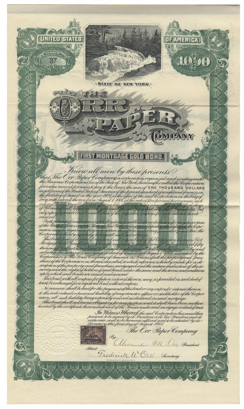 1901, New York. Bond for $1000 bearing 5 percent interest. Green/Black. Vignette at top center of flowing river. Revenue stamp at bottom. Coupons attached at top. Uncancelled and Very Fine.