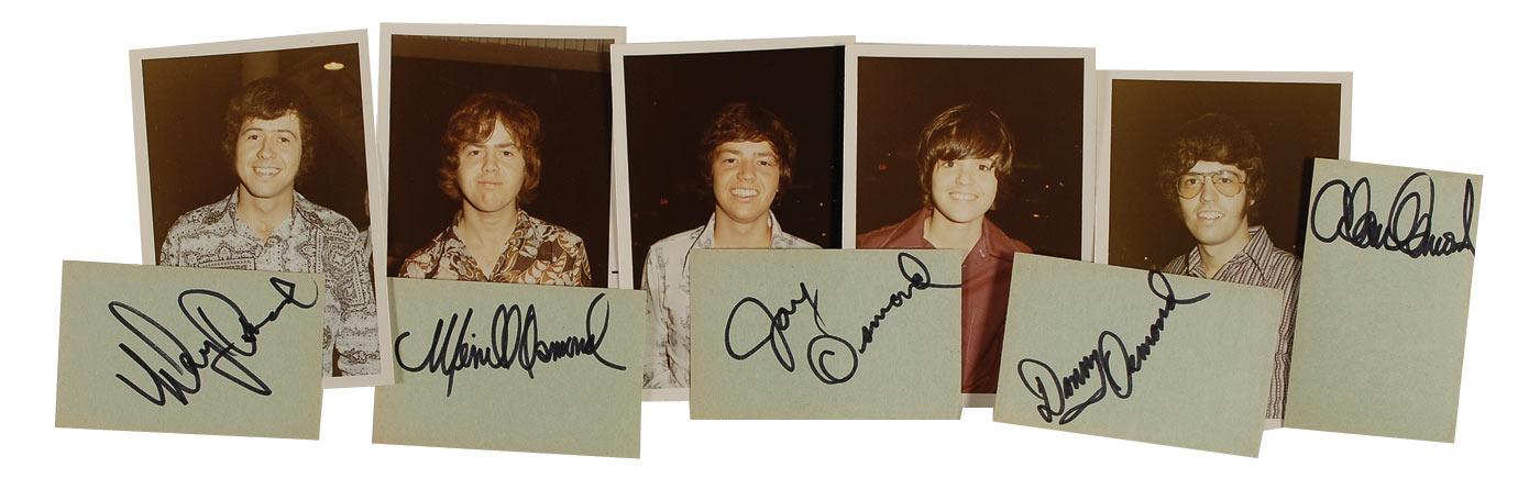 Felt tip signatures of Donnie, Jay, Merrill, Alan, and Wayne Osmond on individual 3.75 x 2.25 light green note pad sheets. In fine condition, with the slightest uniform toning around the edges of the signatures. Accompanied by five 3.5 x 5 glossy candid photos of each brother.