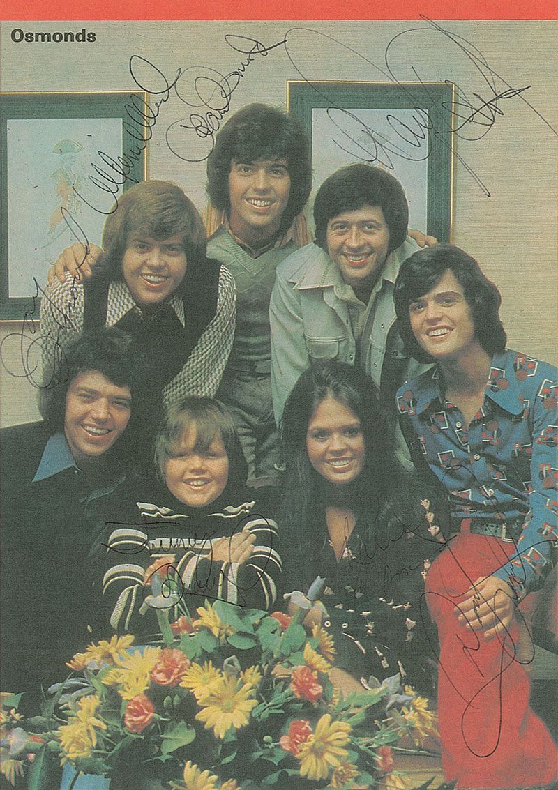 Color 7 x 10 magazine photo of Alan, Donny, Jimmy, Jay, Wayne, Merrill, and Marie Osmond, signed in black ballpoint by all seven. In fine condition, with moderate contrast to some signatures against the busy shirt patterns. Accompanied by a certificate of authenticity from Tracks.