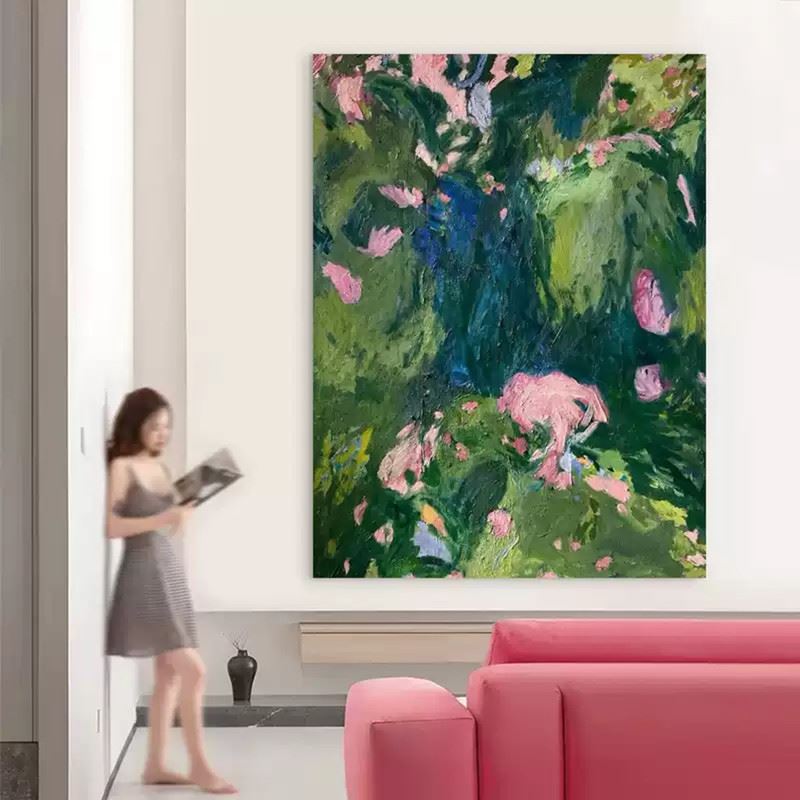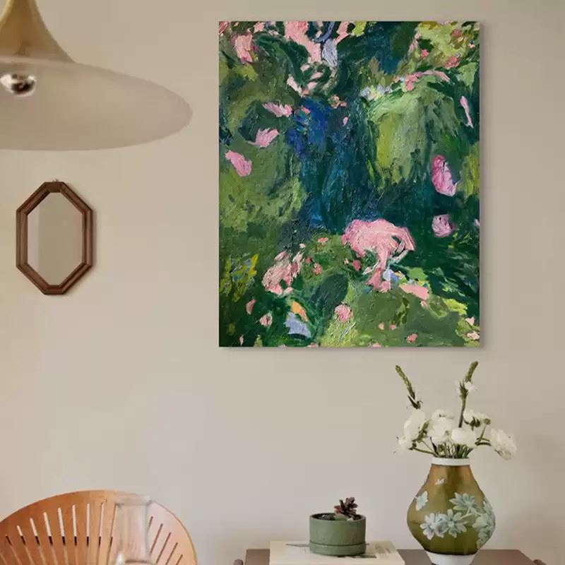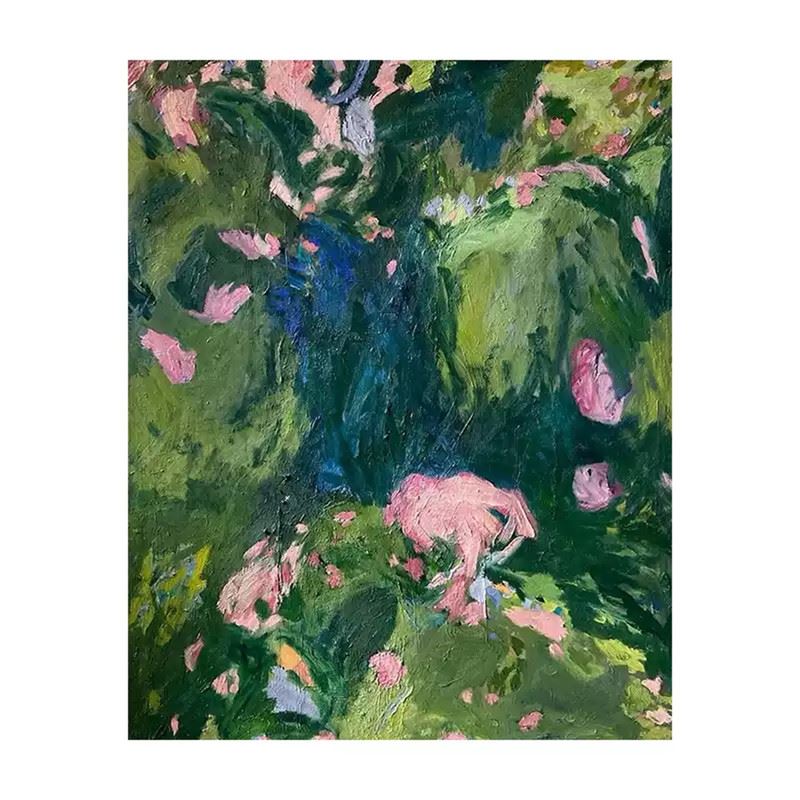 This painting captures the fusion of passion and tranquility in nature, with lush green and soft pink tones intertwining, symbolizing the resonance between deep emotions and the serene other shore of the heart. Dimensions: 24 x 31 inches.