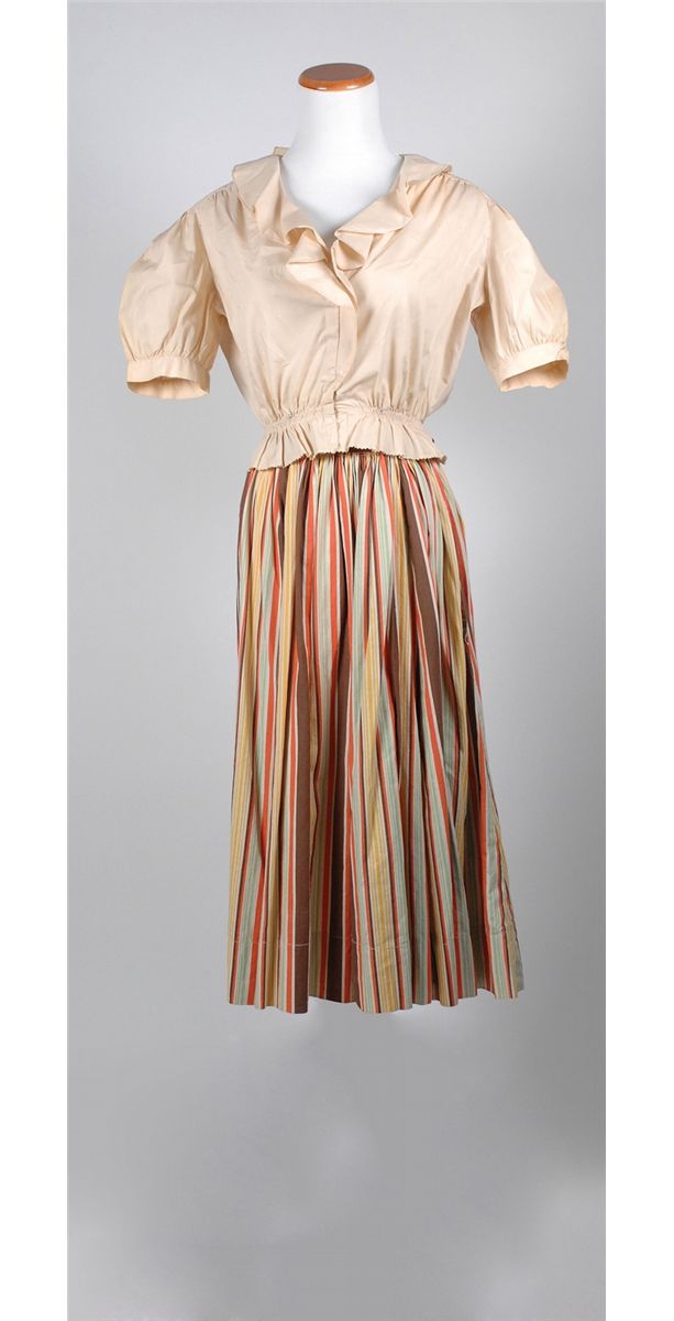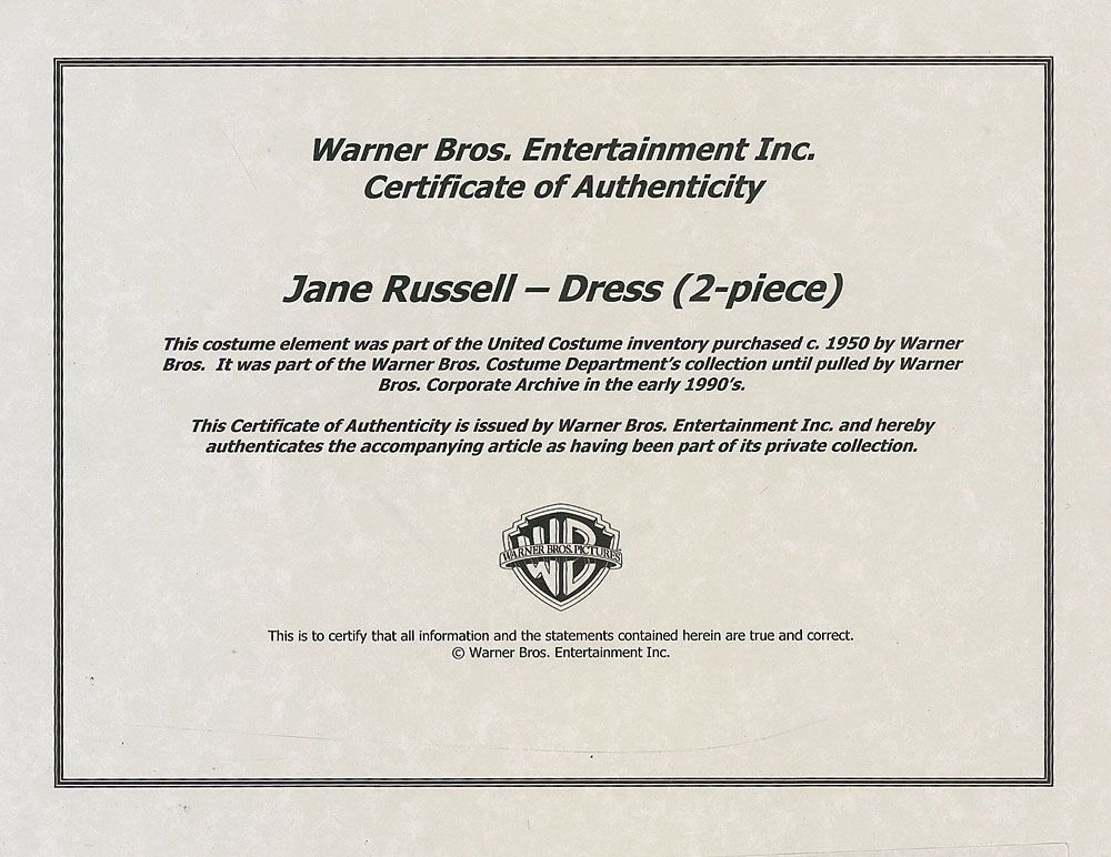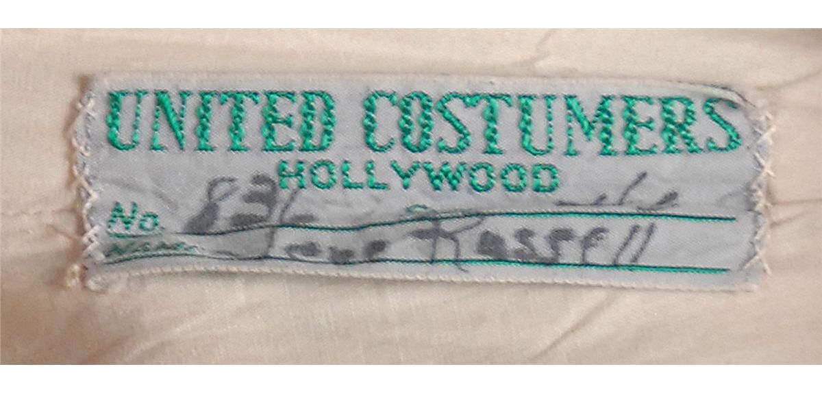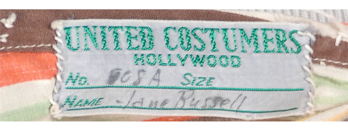 Production-made costume made for Russell for the 1943 film The Outlaw. Outfit consists of an off-white short-sleeve blouse with a United Costumer’s tag sewn inside with, “No. 836, Size #6, Jane Russell” written on the two lines provided; and a multi-colored striped skirt with a hook and eye closure in the back, also with a United Costumer’s label with Russell’s name written on the second line. In fine condition. Accompanied by a certificate of authenticity from Warner Bros. Entertainment stating the costume was part of the United inventory purchased circa 1950.