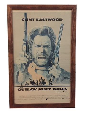 Original, framed movie poster for "The Outlaw Josey Wales...an army of one". Starring Clint Eastwood, Chief Dan George, Sondra Locke, Bill McKinney, John Vernon, Sam Bottoms, and Will Sampson. Clint Eastwood also directed the Civil War western. Roy Andersen is the artist for the poster. 1976 Warner Bros. Numbered 76/152. (43"x28") Glass framed. Horizontal fold creases along the entire poster. This rare and collectible poster, printed in 1976 to promote the theatrical release of The Outlaw Josey Wales, is not a reproduction or a reprint.