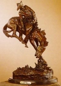 This bronze sculpture is mounted onto a green marble base, stands 23" high, and is signed with the artist's name in the bronze.