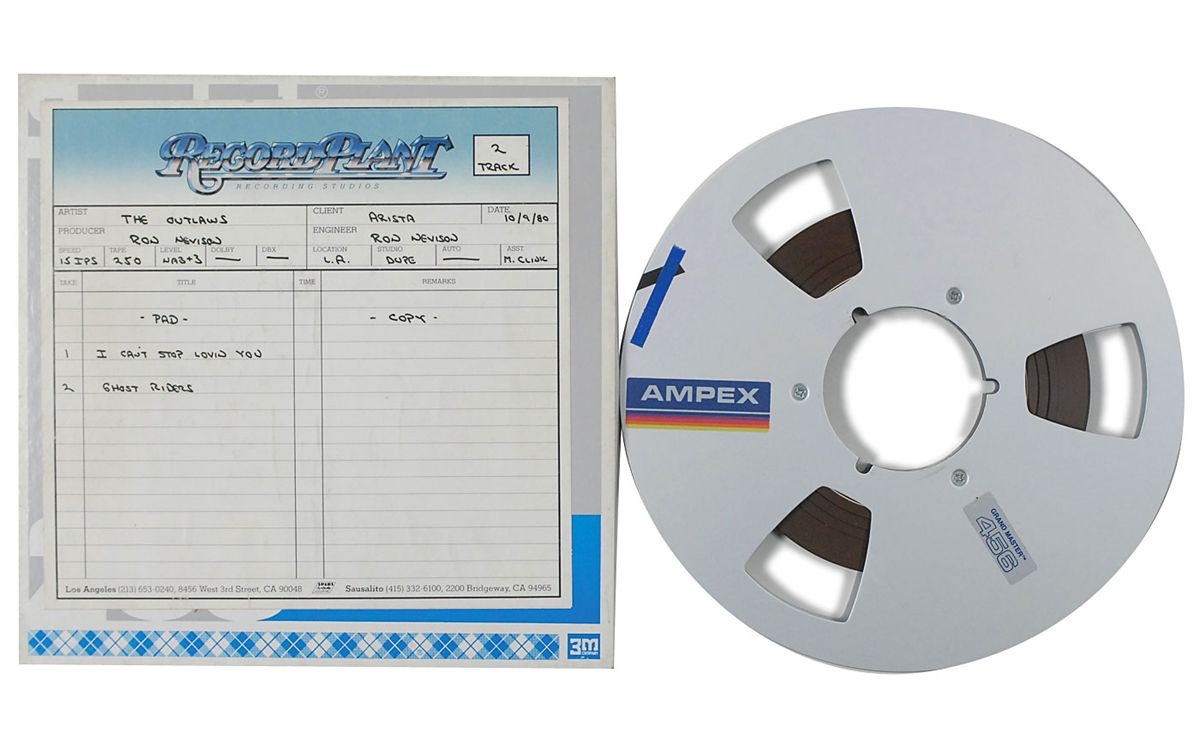 Vintage “copy” 10? tape reel of two Outlaw songs featured on their 1980 album Ghost Riders. Affixed to the box is a large Record Plant Studios label, dated October 9, 1980, hand-notated with relevant information and technical data, including “Artist: The Outlaws, Speed: 15 IPS, Level: NAB+3,” and two listed tracks, ‘I Can’t Stop Loving You,’ and ‘Ghost Riders.’ A three-page photocopy of handwritten music and lyrics for ‘Ghost Riders,’ by Billy Nicholls is present in the box. In overall fine condition. The band’s cover of ‘Ghost Riders in the Sky,’ was one of their most successful songs, exposing them to attention outside of the southern rock community. Originates from the personal collection of legendary engineer and producer Ron Nevison.