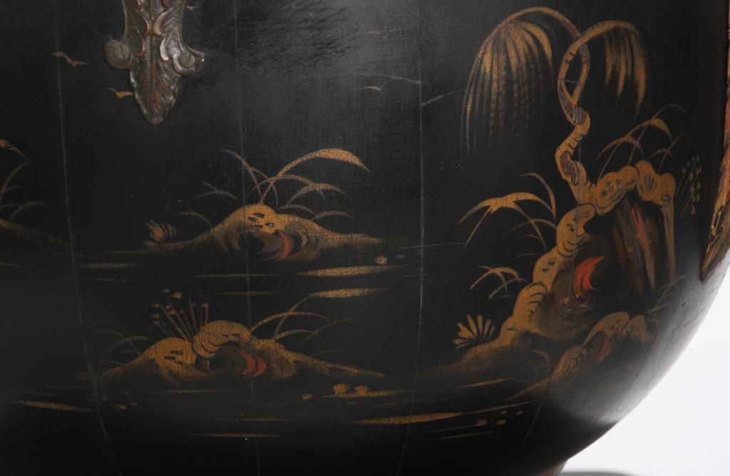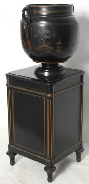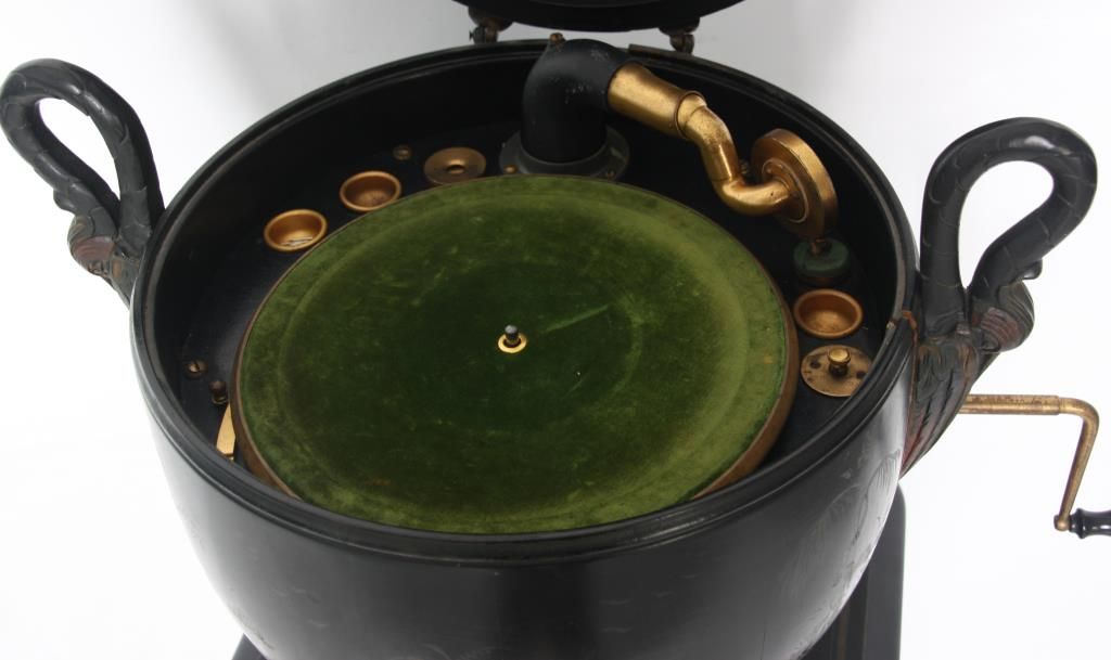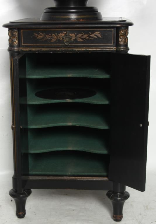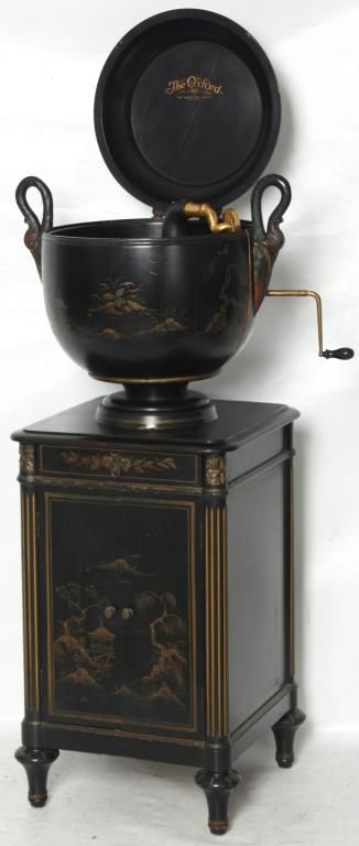 The Oxford Urn Shaped Phonograph.The phonograph body has an urn form with carved stork handles on the side and hinged lid; under the lid is the turn table and brass tone arm feeding into the lower bowl section of the urn, acting as the horn. On a matching 1 drawer over 2 door base with round fluted corner columns and gilt decorated of an oriental scenic view; the drawer and 5 shelves behind the doors are lined with original green felt. Stenciled signature under the lid reads – The Oxford, The Mundler Corp. New York. Has a seem separation in the right side of the urn. 49 in. high x 18.5 in. wide x 18.5 in. deep.