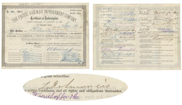 Subscription certificate for $5,000 in stock and $10,000 in bonds. Signed twice on verso “Drexel, Morgan & Co,” by J.P. Morgan. New York. January 20, 1880. Issued to Lorenzo Delmonico and signed on verso. “The Pacific Railway Improvement Company made a public offer in 1880 for subscriptions for the first mortgage bonds of the Texas Pacific Railway Company. Funds were required for building a line between Fort Worth and Rio Grande, a distance of about 600 miles. The funds offered were of $1,000 denomination, bearing interest at the rate of 6 per cent per annum. As a inducement, the company offered for every subscription or $900 paid in addition to the first mortgage bond stock in the road to the amount of $500. The installments were to be paid whenever the Improvement Company required money to carry on its work. The subscribers received certificates upon which the amount of their respective payments was entered.” (New York Times, November 29, 1882) Signed on the front by Charles H. Woerishoffer. An interesting and unusual association.