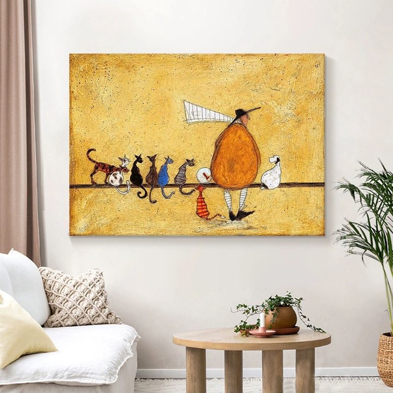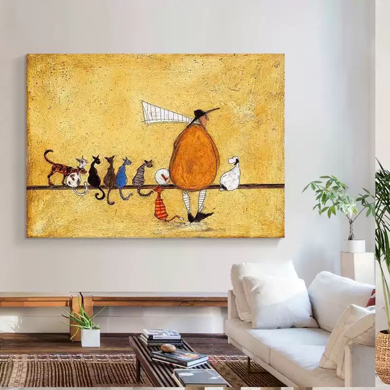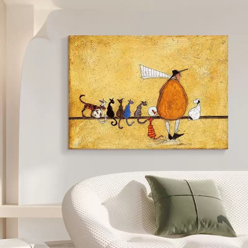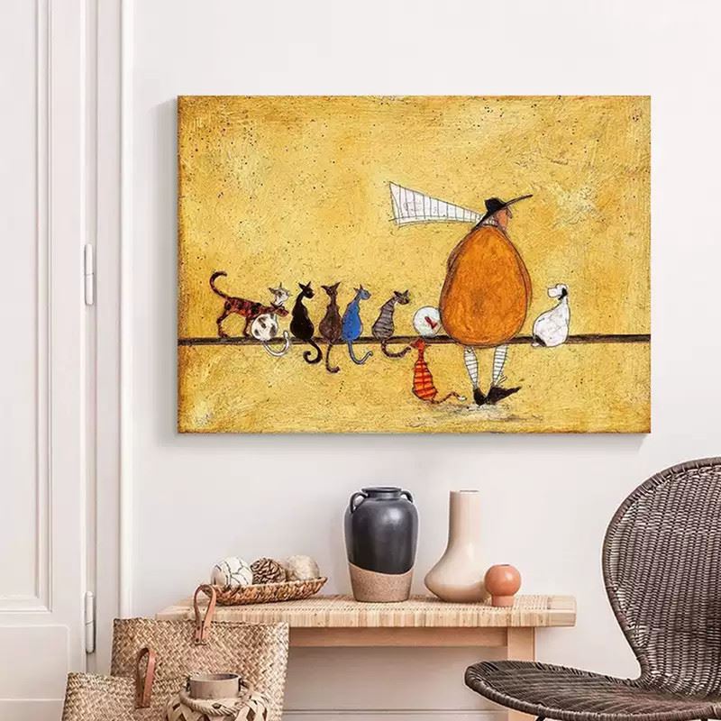 This delightful piece features a quirky figure accompanied by a charming line-up of cats, each with its own unique personality. The figure, with a large, exaggerated hat and a whimsical gait, leads the procession across a simple, warm-colored background. The diverse and playful postures of the cats add humor and lightheartedness to the scene, making it a fun and imaginative portrayal of a whimsical journey. The light texture and earthy tones further enhance the quirky charm of the composition. Dimensions: 31 x 24 inches.