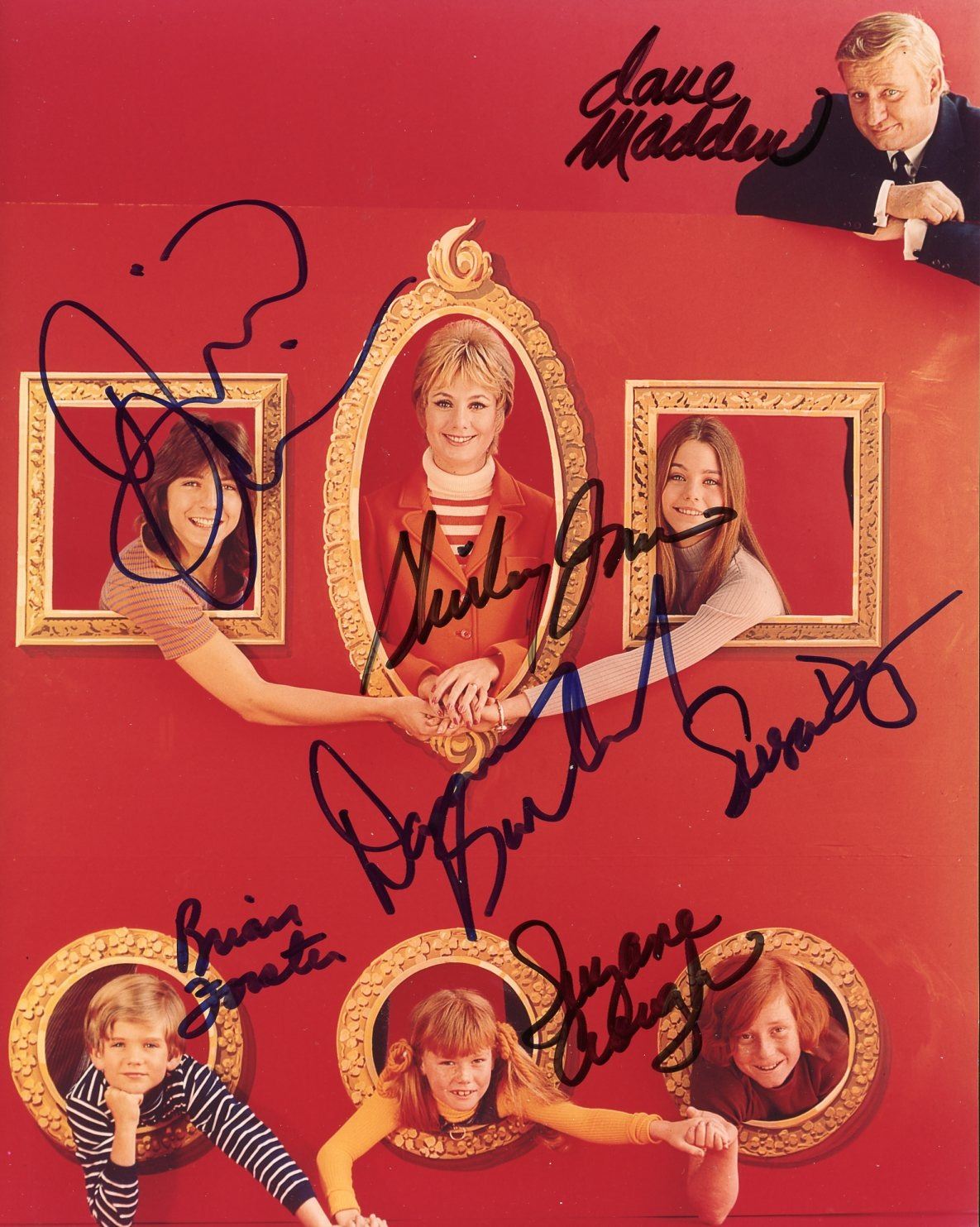 8x10 photo signed by The Partridge Family cast members Dave Madden, Shirley Jones, David Cassidy, Susan Dey, Danny Bonaduce, Brian Forster, and Suzanne Crough