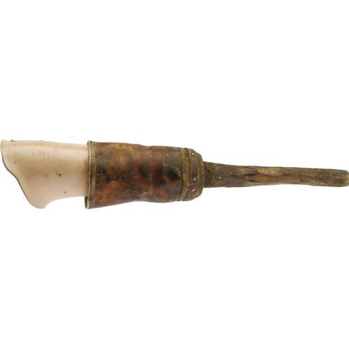 <B>"The Patriot" Peg Leg Prop.</B></I> Colonial era-style peg leg of leather and wood construction, as well as a rather anachronistic rubber traction pad mounted on the bottom worn by actor Joey D. Vieira, noted actor. As a child, Joey played Porky on the early episodes of Lassie. In Excellent condition. <I>Accompanied by a LOA from the L. A. Prop and Wardrobe Co., formerly known as Hollywood Prop Supply.</B></I>