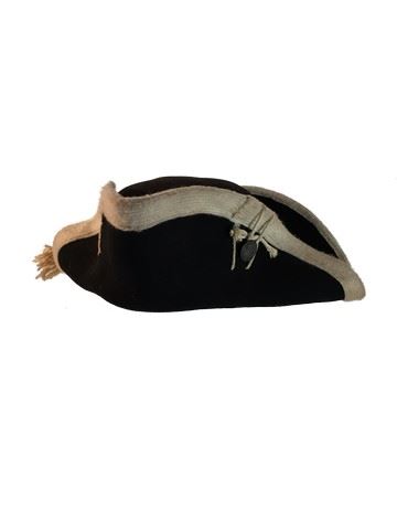 The Patriot (2000) - Tricorn hat as worn by British Enlisted Soldiers, on-screen, in the 2000 film "The Patriot". Black portion of hat is felt, with decorative cotton embroidery around the top. Cockade (ribbon and button) on left side of hat with nylon rope around the top of the hat. From Todd Fisher/Debbie Reynolds archives.