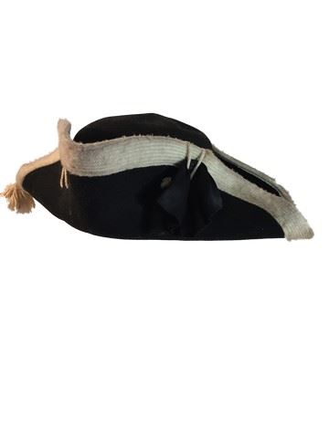 The Patriot (2000) - Tricorn hat as worn by British Enlisted Soldiers, on-screen, in the 2000 film "The Patriot". Black portion of hat is felt, with decorative cotton embroidery around the top. Cockade (ribbon and button) on left side of hat with nylon rope around the top of the hat. From Debbie Reynolds archives collection.