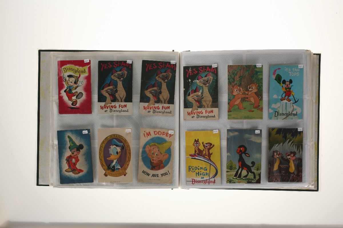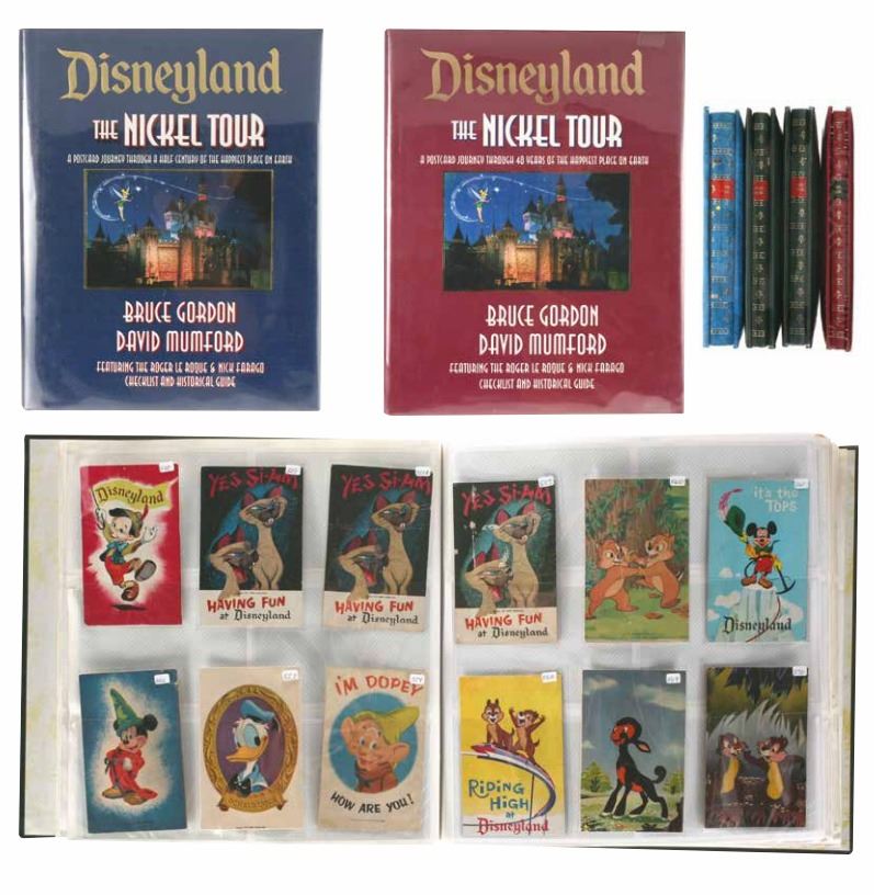 In 1995, Bruce Gordon and David Mumford self-published one of the most definitive books on Disneyland History ever made. Tracing fifty years of Disney History through the postcards sold in the park, with their revised edition published in 2000, they created a visual history that is unequaled. With the help of collectors Roger Le Roque and Nick Farago, they compiled a list of every postcard known to be produced for the park. This set belonged to collector Patty Asker, who set out to collect every postcard listed in the book; approximately 1,514 of them. Offered here is Patty Asker's collection of postcards based on both editions of the Nickel Tour books. With a total of 1,458 cards, this is the most complete collection of Disneyland postcards ever offered for sale. The collection includes the most rare cards produced for the park, including an unused Sleeping Beauty Castle record card. This card is Nickel Tour #1175, and is the only one we have ever seen. Additionally, the rare "Puzzle Postcards", Nickel Tour #602a-602c, and the ultra-rare "Silver Banjo Card" from Don DeFore's Silver Banjo Restaurant, Nickel Tour #1120b, are also included. This collection represents 30 years of research, persistence, and passion, and is an amazing feat of collecting that would be almost impossible to duplicate today. Signed editions of both Nickel Tour books are also included in this lot.