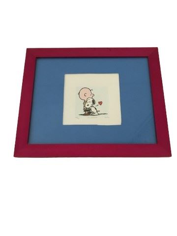 The Peanuts: Charlie Brown and Snoopy. Sowa & Reiser, etching with hand tinted color. Framed (glass). Numbered 173/500. Image size: 2"x2". Frame Size: 11"x9".