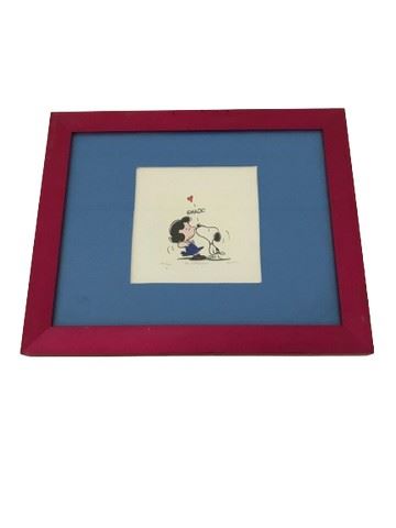 The Peanuts: Lucy and Snoopy - The Kiss. Sowa & Reiser, etching with hand tinted color. Framed (glass). Numbered 204/500. Image size: 2"x2". Frame Size: 11"x9".
