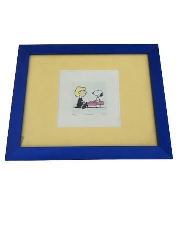 The Peanuts: Schroeder and Snoopy - Concerto for Two. Sowa & Reiser, etching with hand tinted color. Framed (glass). Numbered 333/500. Image size: 2"x2". Frame Size: 11"x9". Condition: Frame cracked bottom left side.
