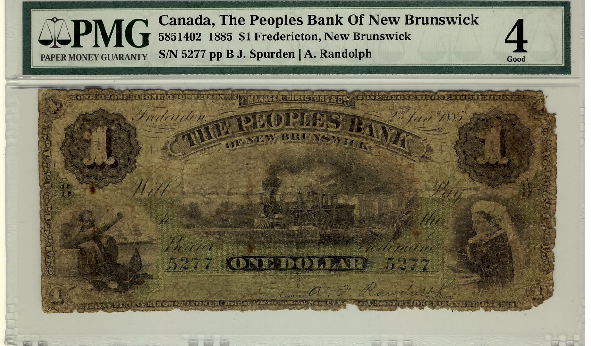 The Peoples Bank of New Brunswick 1885 $1 5277 CH-585-14-02 PMG G4