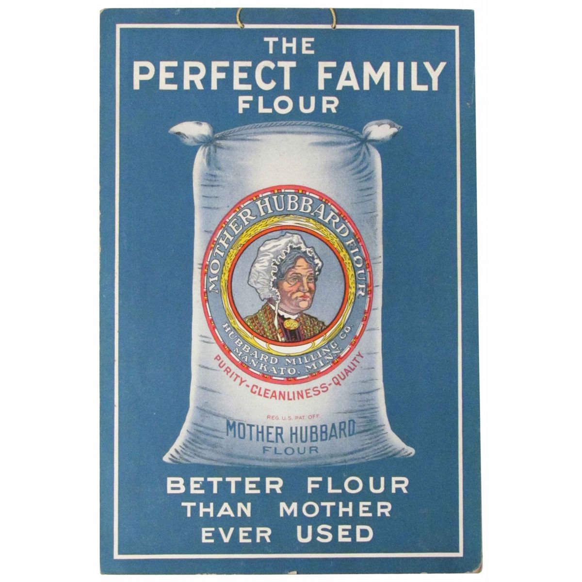 The Perfect Family Flour Cardboard Sign. Two sided string hanger. Mother Hubbard Flour. Very slight wear bottom right corner otherwise excellent condition. 8 1/4 X 12 1/4 inches.