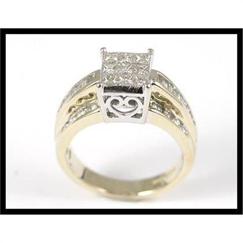 This perfect lady's 14K yellow gold ring consists with 9 invisible set princess cut diamonds, 16 full cut diamonds, and 14 baguette cut diamonds that have an estimated total weight of 1.50 carats. This ring is in size 7 and weights 8.00 grams. The diamonds are shinny and the color is good.