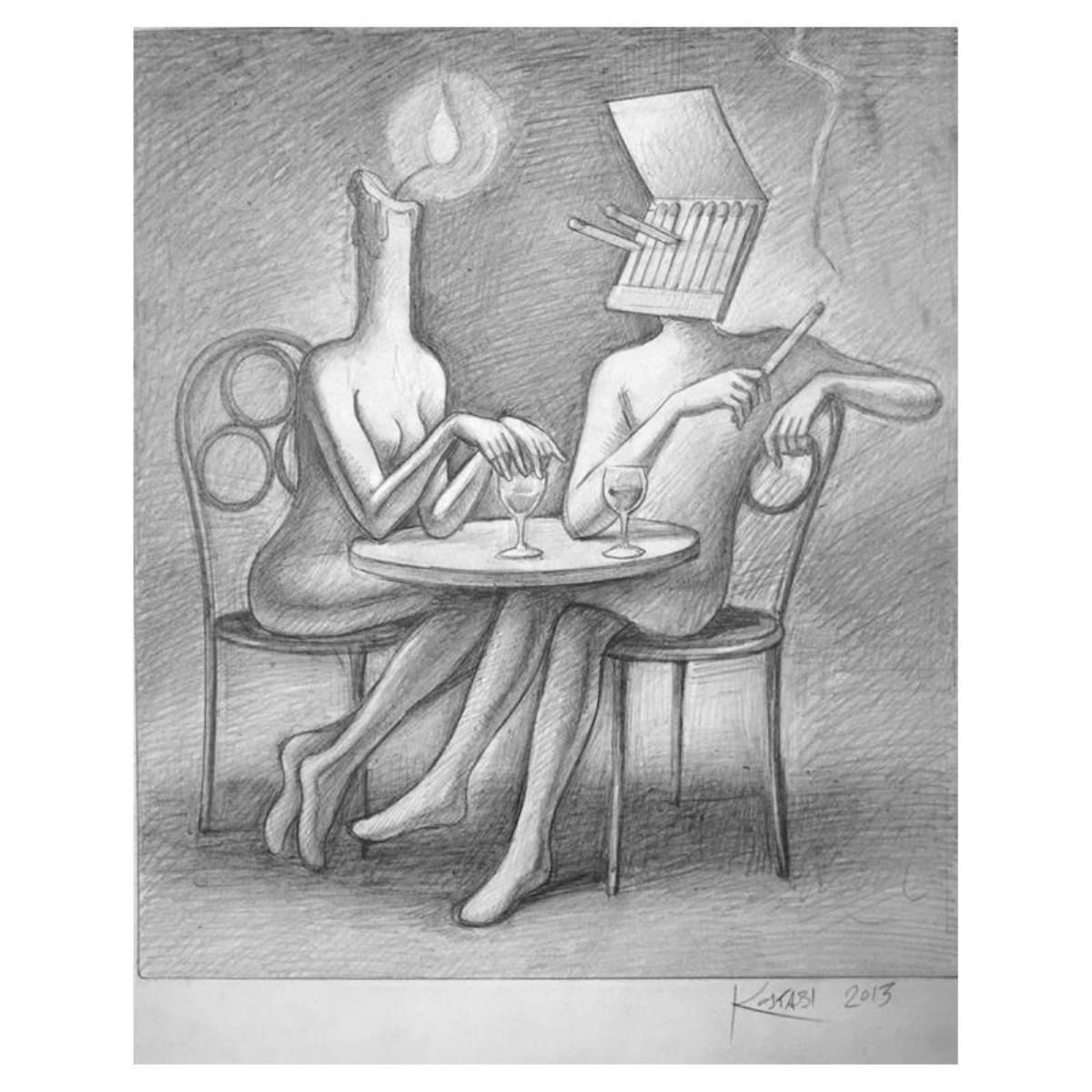 The Perfect Match by Kostabi Original. "The Perfect Match" is an original artwork, pencil on paper, by Mark Kostabi. The piece is hand signed and comes with a certificate of authenticity. Measures approximately14" x 11".