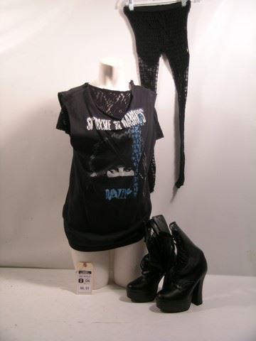 Seen in the 2012 coming of age film 'The Perks of Being a Wallflower', this is a screen used, hero costume worn by Mary Elizabeth (Mae Whitman). The film centers around a young, introverted high school student who is brought out of his shell by two quirky high school seniors. The costume comes complete with a black with cut sleeve and cut neck 'Suzie and the Banchees' t-shirt, floral print lace black top, black leggings, and black platform heels. Also includes a wardrobe tag!
