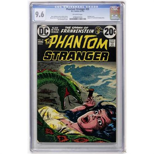 <B>The Phantom Stranger #25 (DC, 1973) CGC NM+ 9.6 Off-white pages.</B></I> Bondage cover by Luis Dominguez. Jim Aparo art. Spawn of Frankenstein backup story with Mike Kaluta art. CGC hasn't awarded a higher grade for this issue to date. Overstreet 2007 NM- 9.2 value = $30. CGC census 10/07: 6 in 9.6, none higher. <I> From the Fantastic Frank Collection.</B></I><BR><BR><b>Shipping:</b> Comics - Slabbed (certified) (<a target="_blank" href="http://www.heritageauctions.com/common/shipping.php">view shipping information</a>)