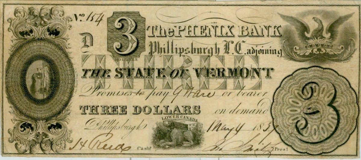 The Phenix bank 1837 $3 CH-590-10-02-06 CCCS VF20. This bank is thought to have been a spurious institution of the type that proliferated during the "Hard Times" period 1837-1839. Although certainly a Canadian issue, the note's use of the Vermont nomenclature was likely done to make people believe that the was from a U.S. bank and to facilitate circulation in Vermont as well. Charlton comments that "All Phenix Banknotes are very rare." Charlton also indicates signed and issued threes as "Institutional collections only," but this is a signed and issued $3 which is available right now to you