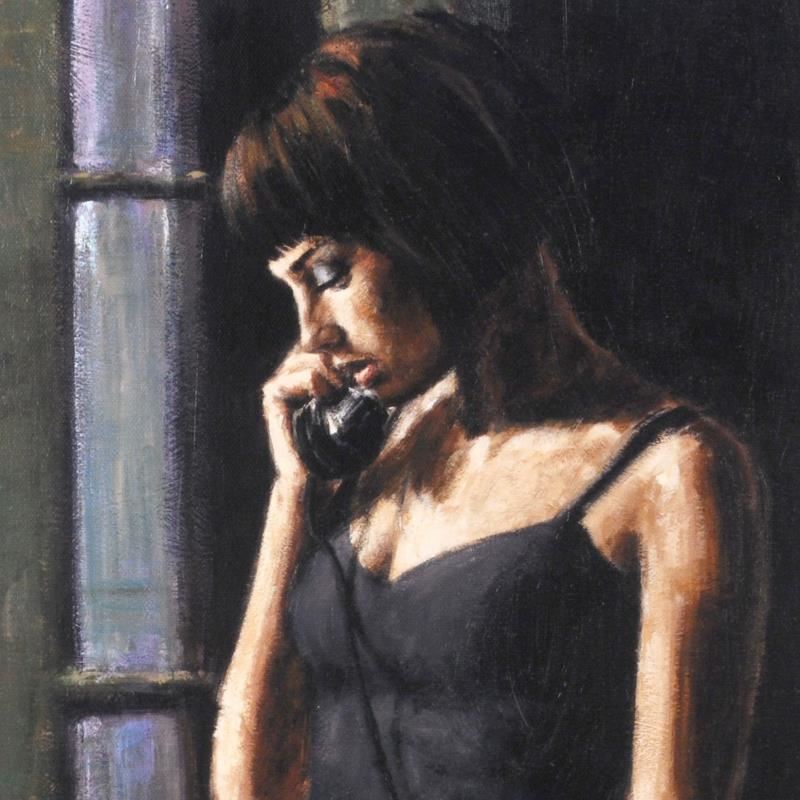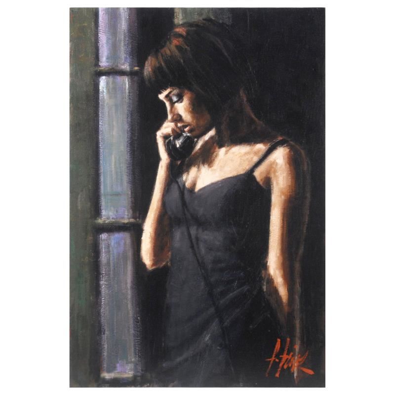 "The Phone Call" is a hand textured limited edition giclee on canvas board by Fabian Perez. The piece is numbered and hand signed. Includes a certificate of authenticity. Measures approximately 16.5" x 11"