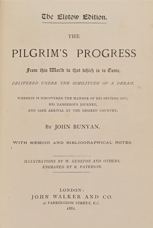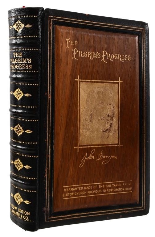 Elstow Edition bound with cover made of the Oak taken from Elstow Church previous to restoration in 1880. Illustrations by W. Gunston and others, Engraved by R. Paterson. Published 1881 by John Walker & Co. of London.