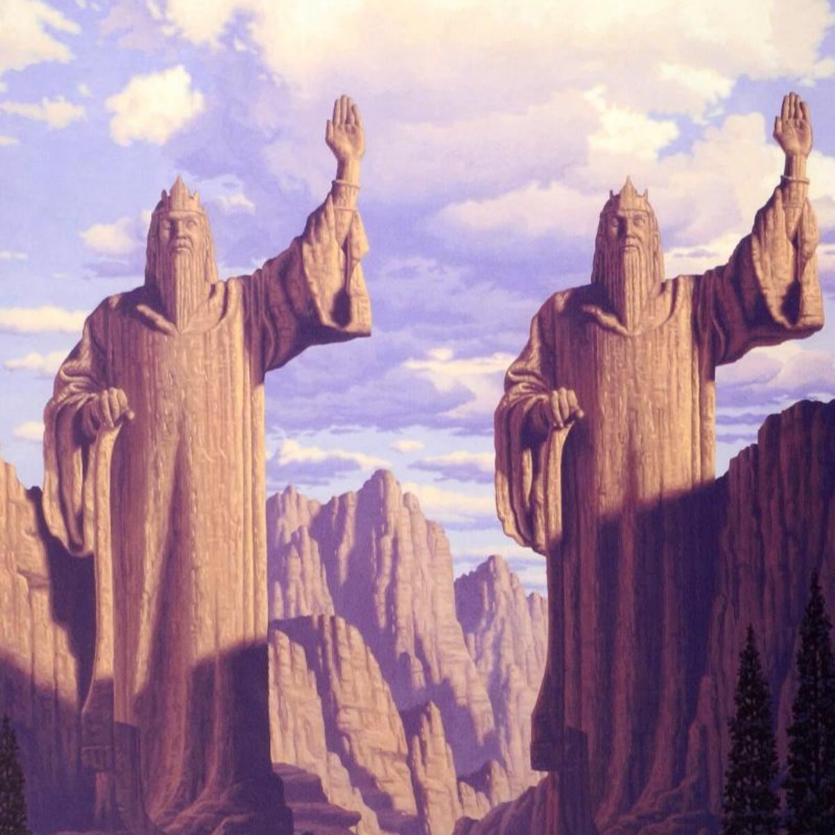 Known world wide for their fantasy and science fiction illustrations, identical twin brothers Greg and Tim Hildebrandt created an abundance of fascinating artwork, most notably their illustration work for J.R.R. Tolkien's 'The Hobbit' and 'Lord of the Rings'. "The Pillars Of The Kings", originally created in the 1970's for Ballantine Books, is a limited edition giclee on canvas, numbered and hand signed by Greg Hildebrandt! Includes Certificate of Authenticity! Measures approx. 28" x 21" (image). Reference #: 193686.
